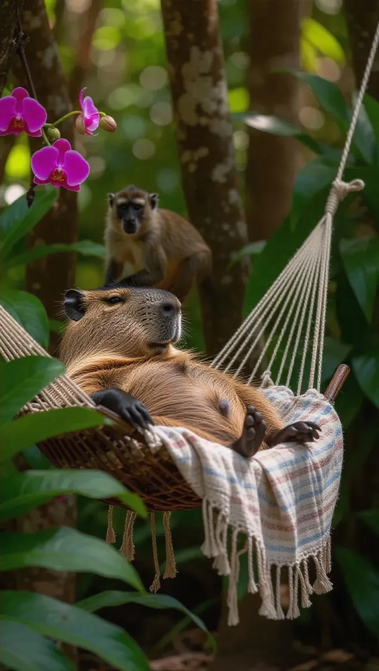 A relaxed capybara lounges on a hammock strung between two trees in the Pantanal, Brazil, its large figure swaying gently. The capybara is draped in a light blanket and has a refreshing drink beside it, its eyes half-closed in contentment. Surrounding it, thick foliage and blooming orchids create a shaded paradise, their colors wildly contrasting. In the backdrop, a curious monkey peers through the leaves, adding charm to the scene. The setting is peaceful and fragrant with sweet tropical blooms.