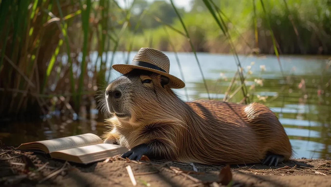 A dreamy capybara dozes off under the dappled sunlight at the river's edge in the Pantanal, Brazil, its ample shape reclining comfortably. The capybara wears a sun hat and has a small book lying beside it, its eyes lazy with sleep. Surrounding it, swaying pampas grass and gentle frangipani create a soft, inviting glade. In the distance, a faint sound of water trickling adds to the ambiance. The air is warm, filled with a sweet floral scent.