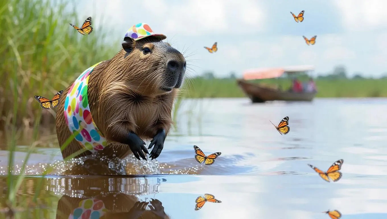A radiant capybara scampers along the banks of the Pantanal, Brazil, its large body bounding joyfully. The capybara is dressed in a quirky costume and has a playful expression, its eyes bright with mischief. Nearby, tall grasses and playful butterflies enhance the lively atmosphere, adding bursts of color. In the distance, a slow-moving boat glides past, creating little waves on the surface. The energy is dynamic and filled with fragrances of blooming nature.