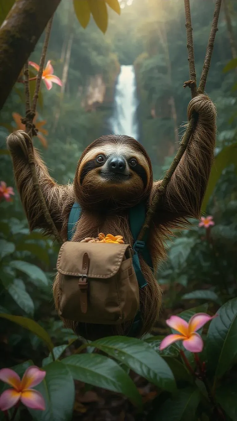 A curious sloth hangs from a tree branch in the Amazon Rainforest, Brazil, its slow movements blending with the rhythm of the forest. The sloth wears a tiny backpack filled with snacks and a pair of sunglasses, its sleepy eyes scanning the lush surroundings. Around it, dense foliage and vibrant flowers create a colorful canopy. In the distance, the sound of a waterfall echoes through the trees, its mist adding a cool freshness to the air.