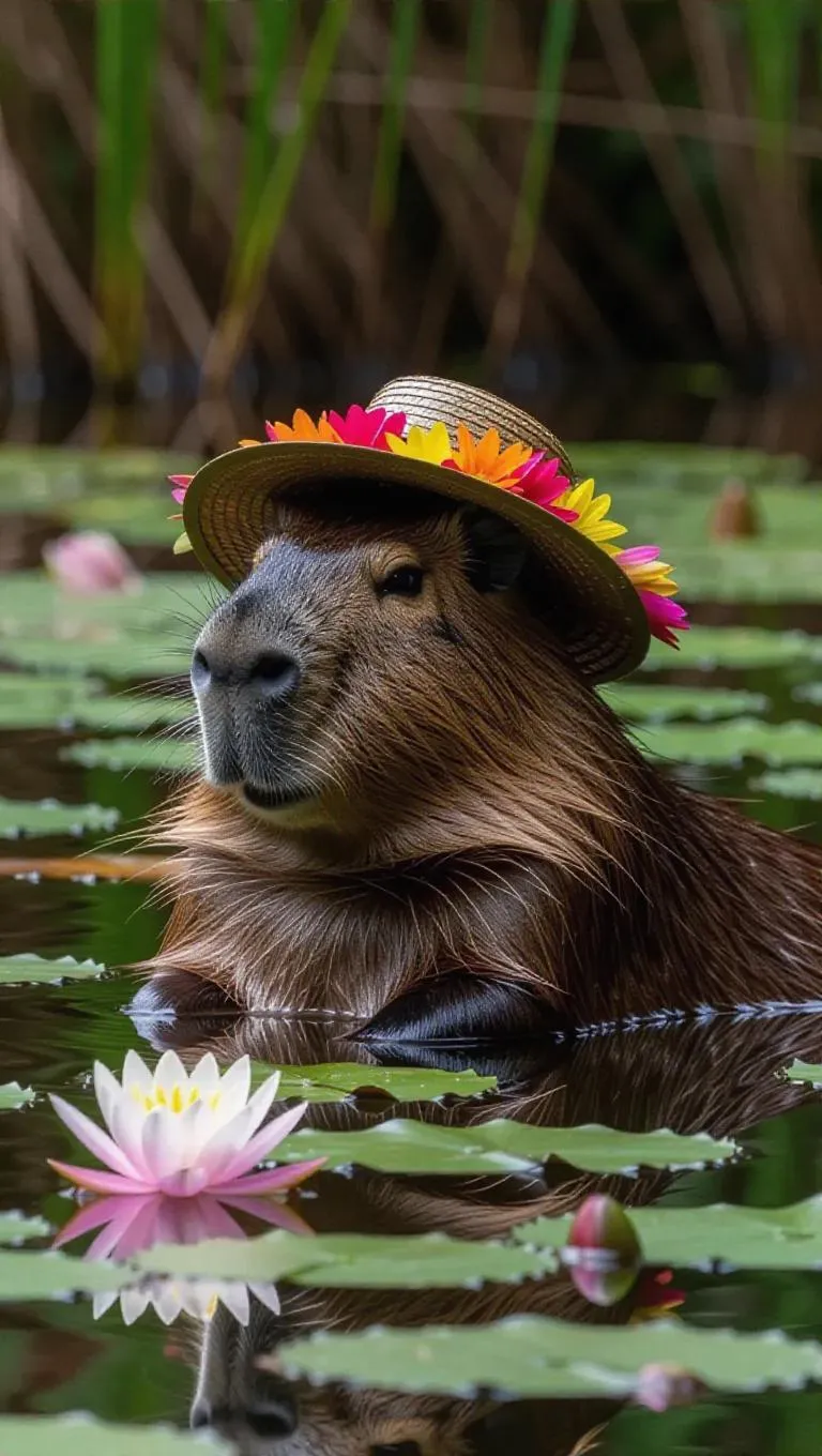 A gentle capybara relaxes by a pond in the Amazon Rainforest, Brazil, its serene presence blending with the tranquility of the water. The capybara wears a colorful sunhat and a flower garland, its calm eyes reflecting the beauty of its environment. Around it, blooming lilies and swaying grass create a peaceful setting. In the distance, the sound of gently flowing water harmonizes with the rustling leaves, adding a soothing rhythm to the air.