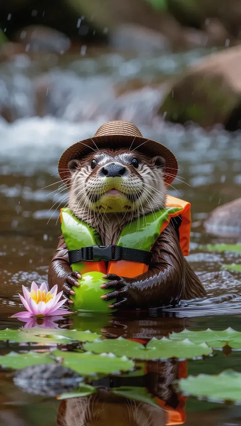 A mischievous otter plays with a toy by a riverbank in the Amazon Rainforest, Brazil, its playful splash adding life to the water. The otter wears a cute life jacket and a tiny hat, its bright eyes sparkling with excitement. Around it, river rocks and water lilies create a fun playground. In the distance, the bubbling of the water mixes with the sounds of chirping birds, enhancing the playful spirit of the air.