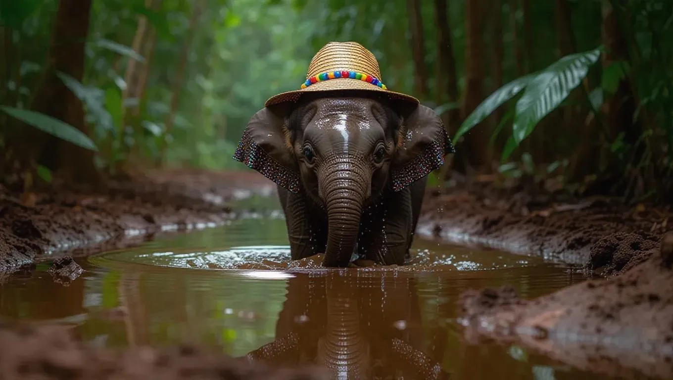 A charming baby elephant splashes in a puddle in the Amazon Rainforest, Brazil, its playful antics creating ripples in the water. The baby elephant wears a cheerful sunhat and colorful beads, its joyful eyes sparkling with excitement. Around it, thick mud and tropical plants create a delightful playground. In the distance, the sounds of laughter and joy echo through the trees, adding to the carefree ambiance of the air.