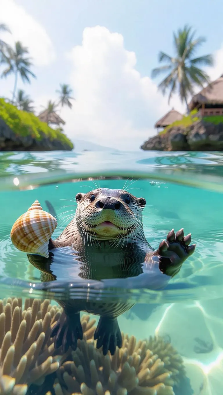 A cheerful otter glides effortlessly through the azure waters of Bali, Indonesia, its smooth fur sparkling under the midday sun. The otter dons a playful mask and flippers, its paws holding onto a shiny conch shell. Nearby, stunning coral gardens and a multitude of fish offer a dazzling display of hues. Far away, a picturesque isle rises above the sea, embraced by golden sands and dotted with palm fronds. The environment buzzes with the scent of salty air and sounds of tranquil surf.