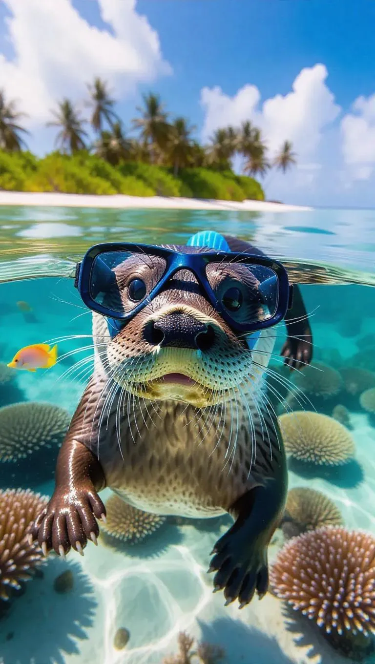 A lively otter swims playfully among the clear waters of the Maldives, its shiny coat glowing under the bright sun. The otter wears a smart snorkel and fashionable goggles, its paws gripping a delicate pearl. All around, brilliant corals and exotic fish form a splendid backdrop of colors. In the horizon, a serene island stands proud, boasting golden shores and lush coconut trees. The air is filled with a refreshing sea breeze and the sound of soft crashing waves.