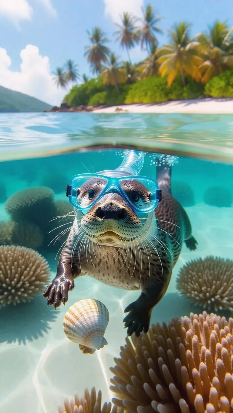 An elegant otter swims smoothly through the transparent waters of the coast of Seychelles, its sleek body reflecting the sun’s brilliance. The otter wears a bright snorkel and a set of cool goggles, its paws clasping a rare seashell. Around it, extraordinary coral formations and schools of fishes fill the scene with vibrant colors. In the distance, a charming island rises, with soft sandy beaches and waving palm trees. The atmosphere is rich with salty tang and the soothing sounds of lapping waves.