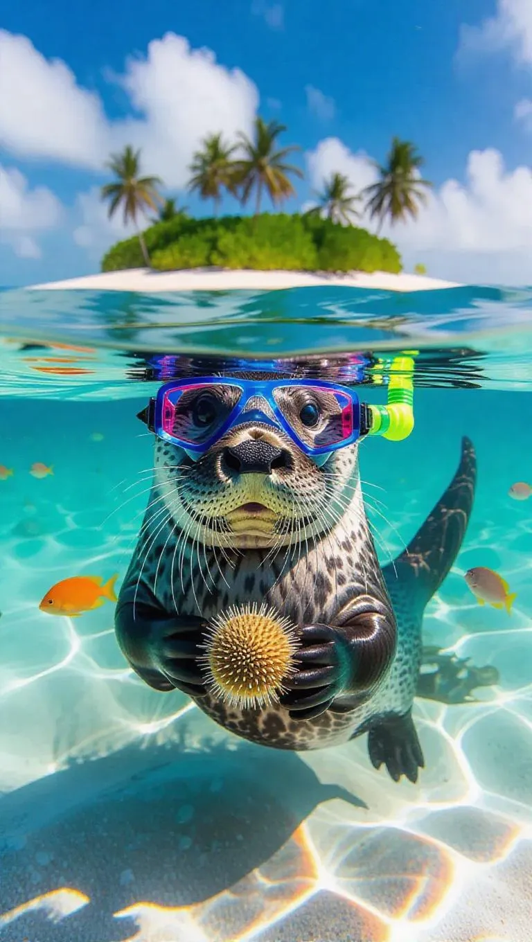 A whimsical otter explores the calm waters of the Whitsunday Islands, Australia, its smooth form shimmering in the afternoon light. The otter sports a playful snorkel and colorful diving glasses, its paws clutching a stunning sea urchin. Nearby, mesmerizing coral structures and lively fish create a colorful underwater wonderland. In the distance, an enchanting island stands, complete with pristine shores and lush palm trees. The air is sweetened by the scent of the ocean and the gentle rhythm of waves.