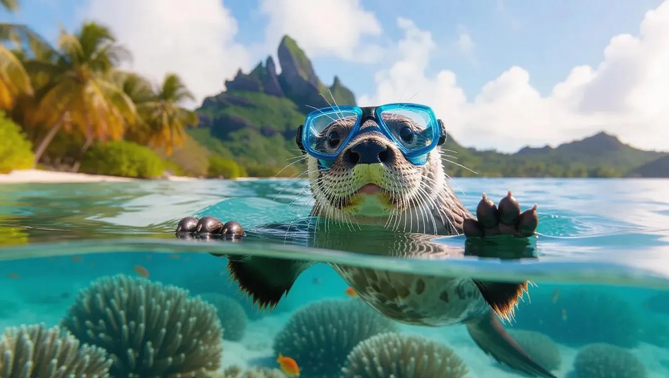 An adventurous otter tumbles joyfully through the transparent waters of Bora Bora, its soft fur glittering in the afternoon light. The otter sports an exciting snorkel and stylish underwater goggles, its paws grasping a dazzling sea glass. All around, colorful coral gardens and a variety of tropical fish paint a lively backdrop. Far away, an idyllic island rests like a jewel, fringed with soft white beaches and graceful palm trees. The atmosphere buzzes with the tang of ocean mist and the sounds of gentle surf.