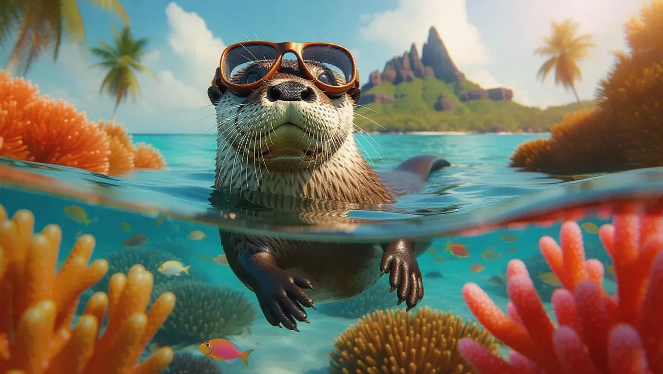 An inquisitive otter frolics through the inviting waters of Madagascar, its sleek body shimmering brightly under the sun. The otter is equipped with a neat snorkel and quirky goggles, clutching a funky shell. All around, colorful corals and playful fish create a vibrant marine environment. In the backdrop, a stunning island looms, adorned with fine sandy beaches and palm tree foliage. The aroma of the ocean breeze fills the air, complemented by the harmonious sound of the waves.