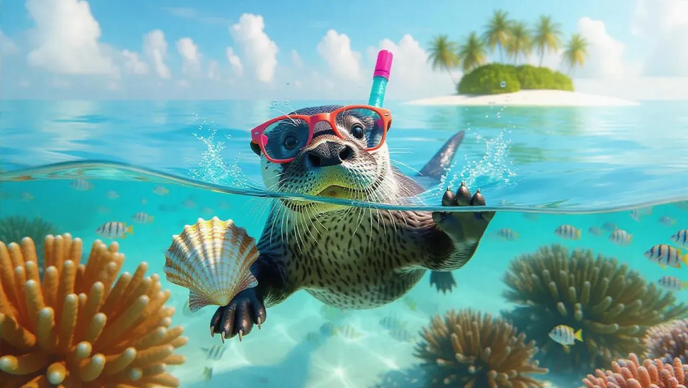 A fascinating otter tumbles through the sparkling waters of the Gulf of Mexico, its sleek form glistening in the sunlight. The otter is wearing a trendy snorkel and funky sunglasses, with paws tightly grasping a vibrant seashell. Surrounding it, unique coral formations and various fish provide a colorful backdrop. In the far distance, a beautiful island emerges, decorated with sandy shores and lively palm trees. The atmosphere is rich with the scent of salty air and the soothing sound of waves breaking.