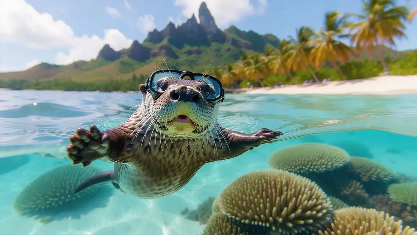 A spirited otter dives through the turquoise waters of the coast of Mauritius, its coat shimmering beautifully in the afternoon sun. The otter flaunts a sleek snorkel and stylish goggles, holding onto a round shell. All around, diverse coral systems and swirling tropical fish paint the scenery with vivid colors. In the background, a breathtaking island stands, adorned with soft sandy shores and palm trees dancing in the wind. The air is fragrant with salt and alive with the sounds of rolling waves.
