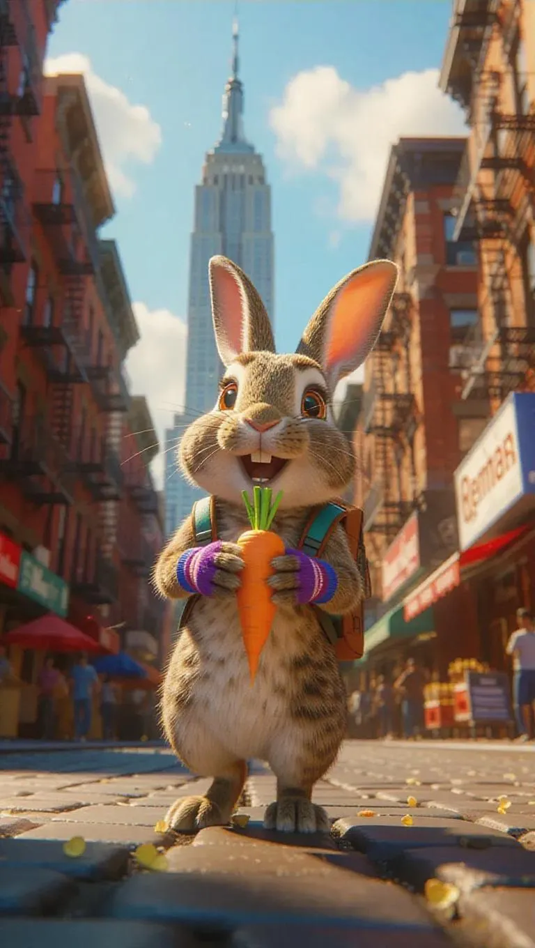 A curious rabbit hops through the vibrant streets of New York City, USA, its paws clutching a small carrot. The rabbit wears a tiny backpack and a pair of colorful gloves, its eyes gleaming with excitement. Around it, towering skyscrapers and bustling cafes create a lively scene. In the distance, the iconic Empire State Building towers above, its silhouette prominent against the blue sky. The air is filled with the scent of popcorn and the sounds of laughter.