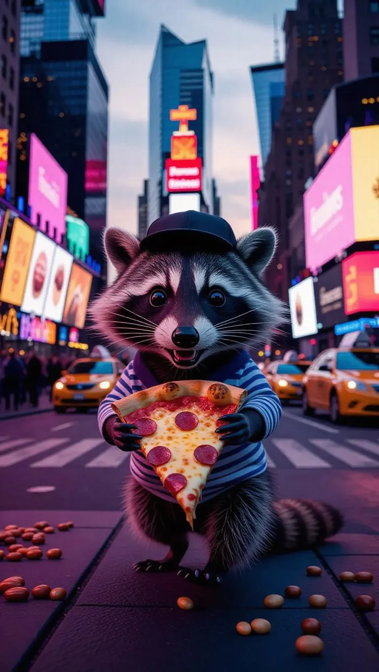 An adventurous raccoon scuttles through the lively streets of New York City, USA, its paws clutching a big slice of pizza. The raccoon sports a tiny cap and a striped shirt, its eyes sparkling with delight. Around it, towering apartments and crowded markets form a bustling environment. In the distance, the iconic Times Square glows brightly, its neon lights vivid against the evening sky. The air is filled with the scent of roasted nuts and the sounds of honking taxis.