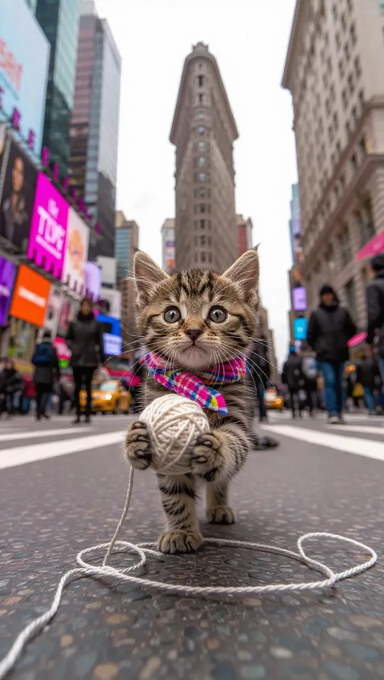 A playful kitten prances through the vibrant streets of New York City, USA, its paws clutching a ball of yarn. The kitten wears a tiny scarf and a bow, its eyes sparkling with wonder. Surrounding it, towering boutiques and busy streets create a colorful environment. In the distance, the iconic Flatiron Building juts out, its shape distinct against the cloudy sky. The air is filled with the scent of fresh coffee and the distant sounds of music.