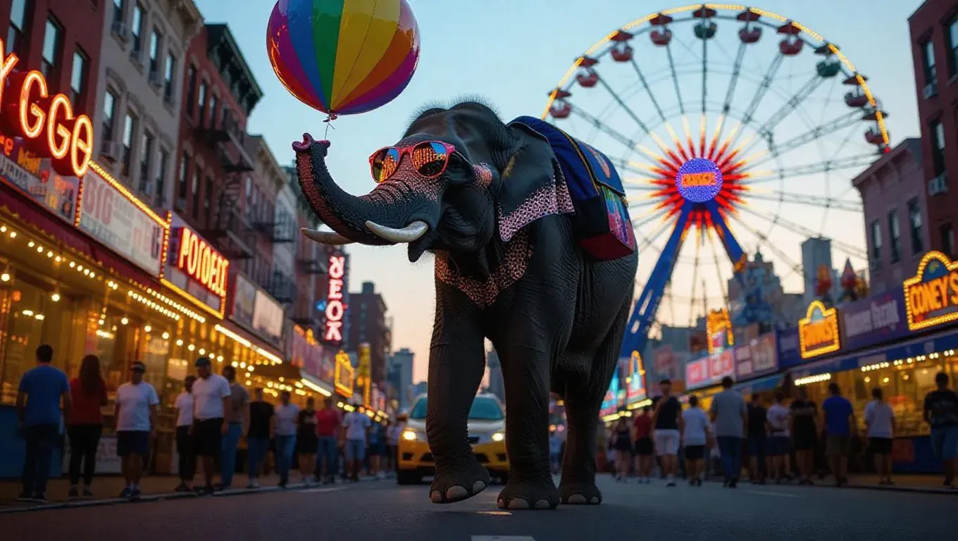 A whimsical elephant trots through the busy streets of New York City, USA, its trunk holding a colorful balloon. The elephant sports a tiny backpack and sunglasses, its eyes shining with glee. Around it, towering structures and lively markets create a bustling atmosphere. In the distance, the renowned Coney Island Ferris wheel spins, its colors bright against the dusk. The air is filled with the scent of cotton candy and the sounds of laughter.