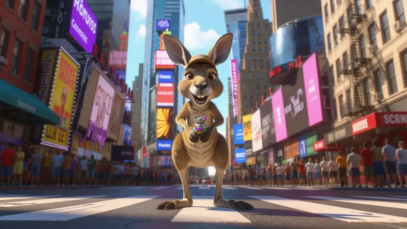 A spirited kangaroo hops through the vibrantly busy streets of New York City, USA, its pouch filled with a small toy. The kangaroo wears a casual cap and a playful shirt, its eyes shining with adventure. Surrounding it, towering skyscrapers and crowded plazas form an animated scene. In the distance, the iconic Hudson River can be seen, its water glistening in the sunlight. The air is filled with the aroma of coffee and the sounds of street vendors.