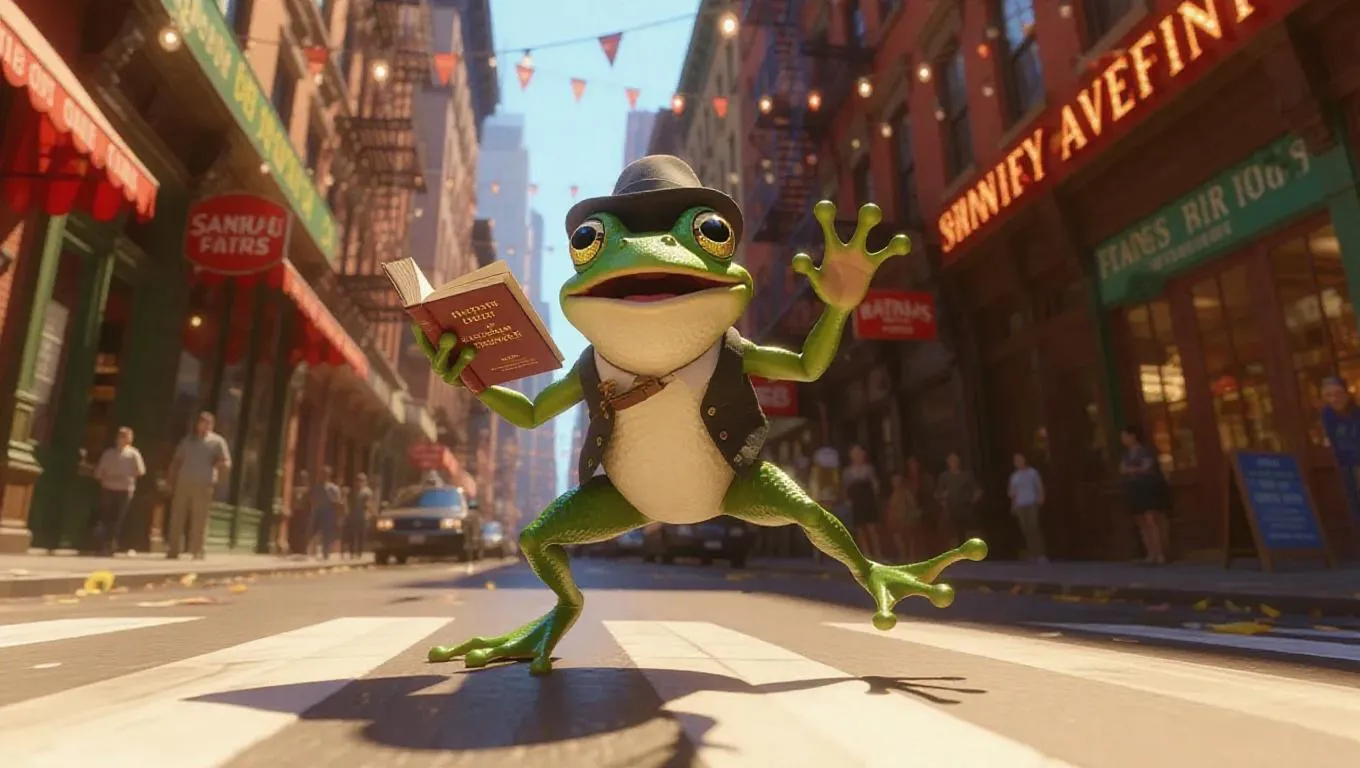An enthusiastic frog leaps through the cheerful streets of New York City, USA, its legs carrying a tiny book. The frog wears a quirky hat and a vest, its eyes sparkling with curiosity. Surrounding it, towering signs and bustling cafes generate a vibrant scene. In the distance, the famous Natural History Museum stands proudly, its facade glowing in the sunlight. The air is filled with the aroma of pastries and the distant sounds of merriment.