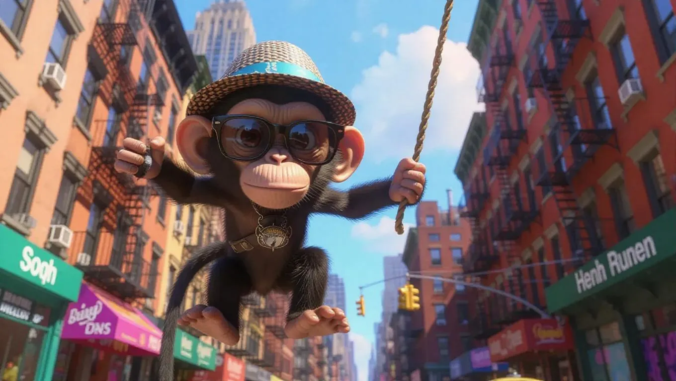 A playful monkey swings through the energetic streets of New York City, USA, its paws clutching a small gadget. The monkey wears a fun hat and stylish sunglasses, its eyes gleaming with mischief. Surrounding it, towering buildings and vibrant street art create an animated ambiance. In the distance, the famous High Line park appears lush and green, its walkways inviting against the urban backdrop. The air is filled with the scent of nearby flowers and the sounds of urban life.
