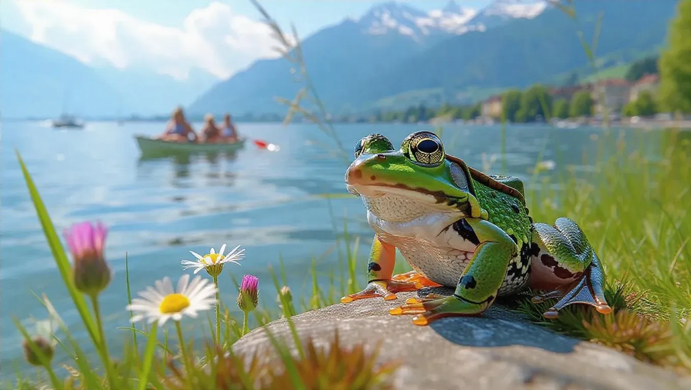 A lively frog hops along the shores of Lake Geneva, Switzerland, its skin a bright green that gleams in the sunlight. The frog has a tiny backpack, ready for an adventure, its jumps energetic and joyful. Nearby, wildflowers and grassy patches flourish, their colors bright against the water's serenity. A paddleboat drifts slowly along the coast, its passengers laughing and enjoying the moment. The air is warm and cheerful, carrying sounds of nature.