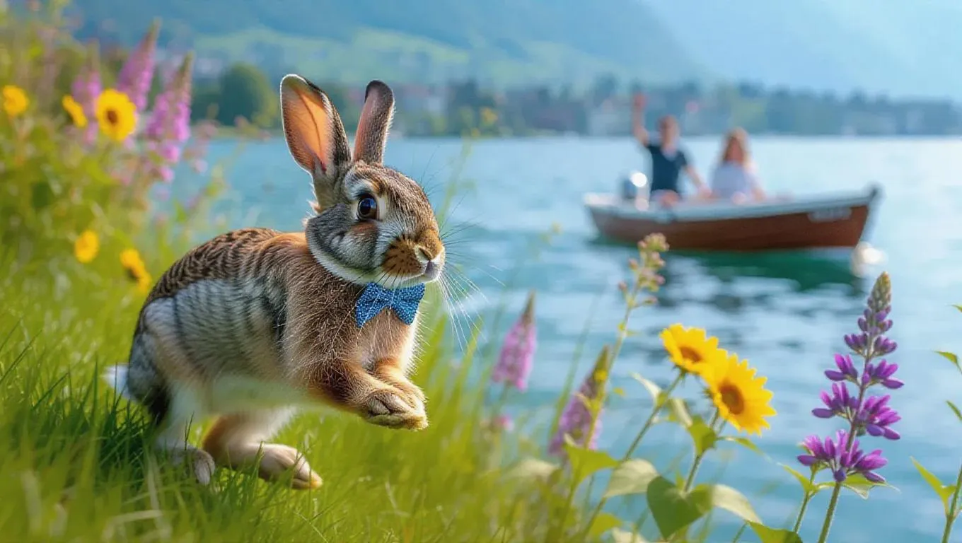 A spirited rabbit darts along the grassy banks of Lake Geneva, Switzerland, its fur a mix of browns and whites shining in the sunlight. The rabbit has a tiny bowtie, adding charm to its demeanor, its hops quick and playful. Nearby, sunflowers and lilacs bloom, their colors bright against the blue sky. A small boat passes by with a cheerful wave from its crew. The atmosphere is joyful, filled with the smell of fresh earth.