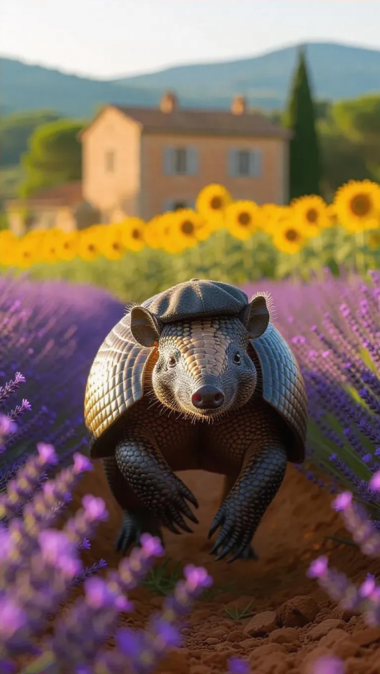 A playful armadillo darts across the vibrant fields of Provence, France, its shell harmonizing with the lavender blooms. The armadillo wears a chic beret and a stylish pair of boots, its eyes sparkling with delight. Around it, rolling hills and sunflowers sway gently, their colors vivid in the soft light. In the distance, a quaint farmhouse sits, its windows reflecting the golden sun. The atmosphere is warm and fragrant with floral notes.
