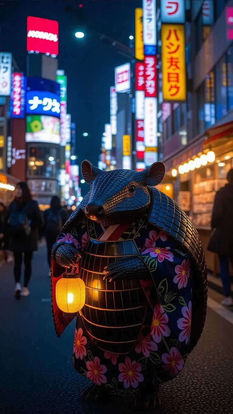 An inquisitive armadillo meanders through the bustling streets of Tokyo, Japan, its shell harmonizing with the city's lights. The armadillo wears a stylish kimono and holds a small lantern, its eyes wide with wonder. Around it, neon signs and lively crowds move energetically, their colors electrifying in the evening glow. In the background, a towering skyscraper shines brightly against the night sky. The atmosphere buzzes with excitement and the aroma of street food.