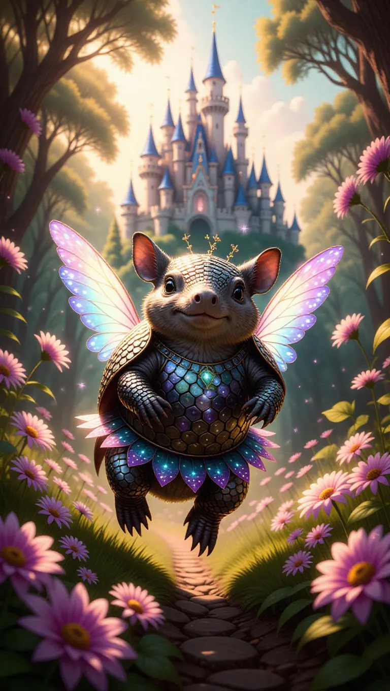 A whimsical armadillo skips through the enchanted forests of Fairyland, its shell shimmering with magical sparkles. The armadillo wears tiny fairy wings and a shimmering dress, its eyes full of wonder. Surrounding it, fantastical creatures and vibrant flowers bloom, their colors alive with enchantment. In the background, a glittering castle sits atop a hill, its towers reaching for the sky. The atmosphere is mystical and sweet with the scent of magic.
