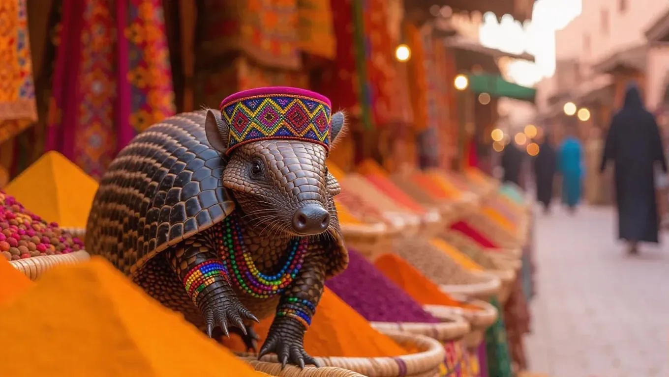 A curious armadillo travels through the bustling markets of Marrakech, Morocco, its shell reflecting the vibrant colors of the bazaars. The armadillo wears a patterned fez and colorful bracelets, its eyes darting from stall to stall. Surrounding it, spices and textiles create a dazzling display, their fragrances mingling in the warm air. In the distance, a historic palace rises, its tiles glowing in the sunlight. The atmosphere is rich with culture and the aroma of spices.