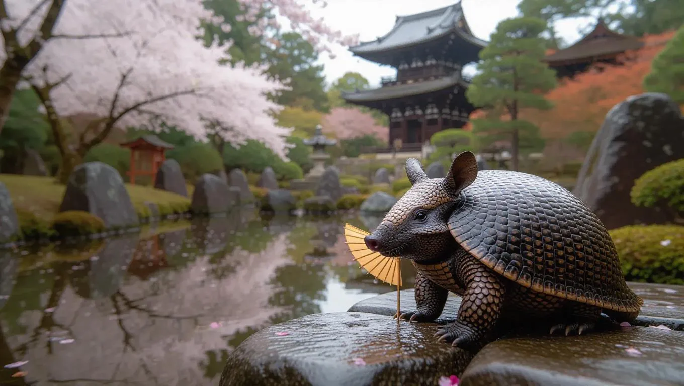 A thoughtful armadillo ponders through the serene gardens of Kyoto, Japan, its shell harmonizing with the stone pathways. The armadillo wears a traditional yukata and carries a small fan, its eyes observing the cherry blossoms. Surrounding it, tranquil ponds and carefully arranged stones create a peaceful setting, their beauty accentuated by the soft light. In the distance, a historic temple stands majestically, its architecture timeless. The air is fragrant with blossoms and stillness.