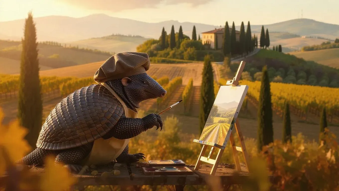 A creative armadillo paints in the sun-dappled fields of Tuscany, Italy, its shell blending with the landscape. The armadillo wears a painter's beret and apron, its eyes focused on the canvas. Surrounding it, rolling hills and cypress trees stretch gracefully, their colors warm in the golden hour. In the distance, a villa stands proudly, its charm timeless and inviting. The air is fragrant with grapes and earth.