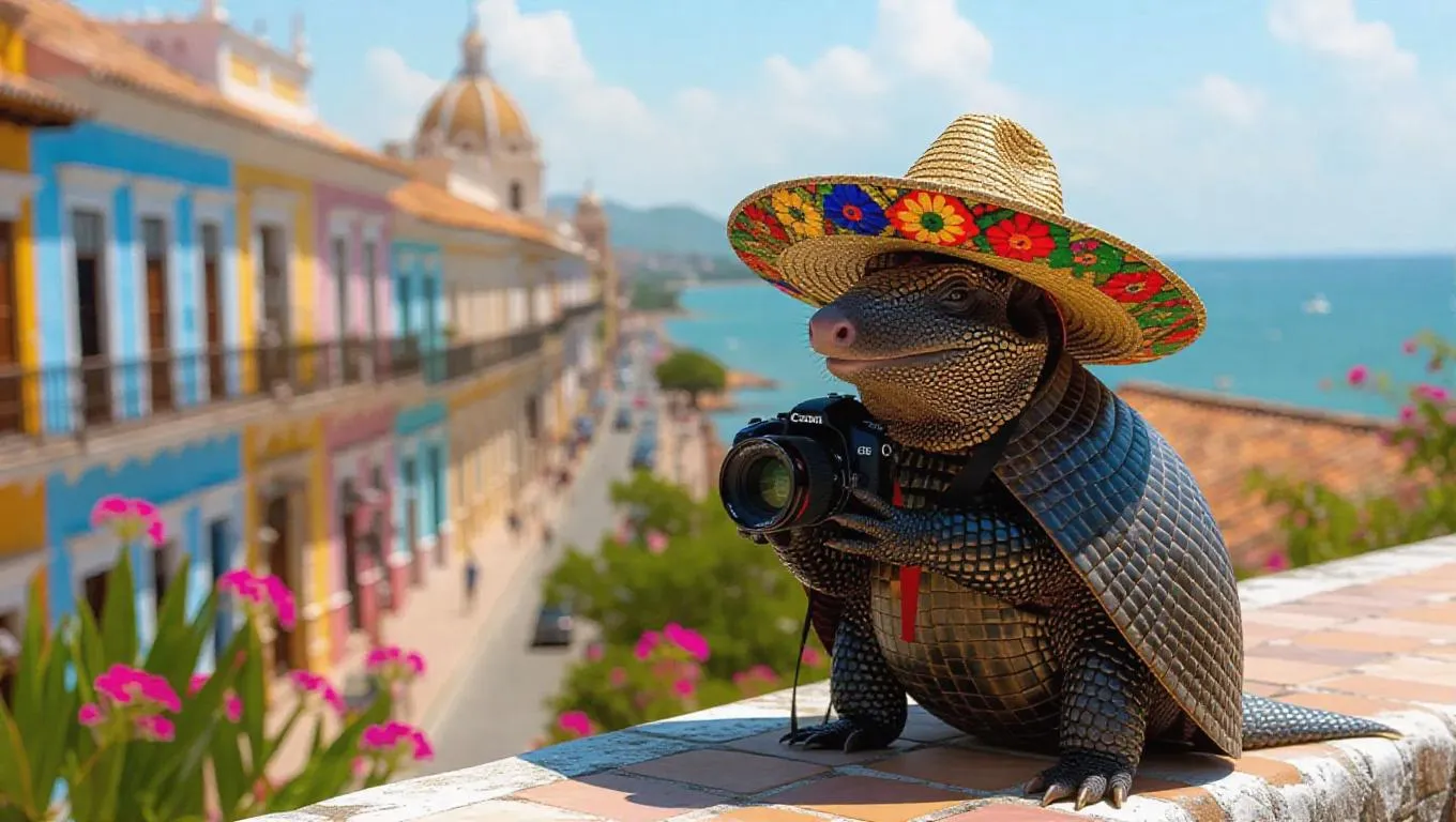 A charming armadillo takes pictures in the colorful culture of Cartagena, Colombia, its shell harmonizing with the vibrant buildings. The armadillo sports a traditional sombrero and carries a camera, its eyes alive with curiosity. Surrounding it, lively plazas and blooming flowers create a vibrant scene, their colors enriching the air. In the distance, the ocean glistens under the sun. The atmosphere is warm and filled with the scent of the sea.