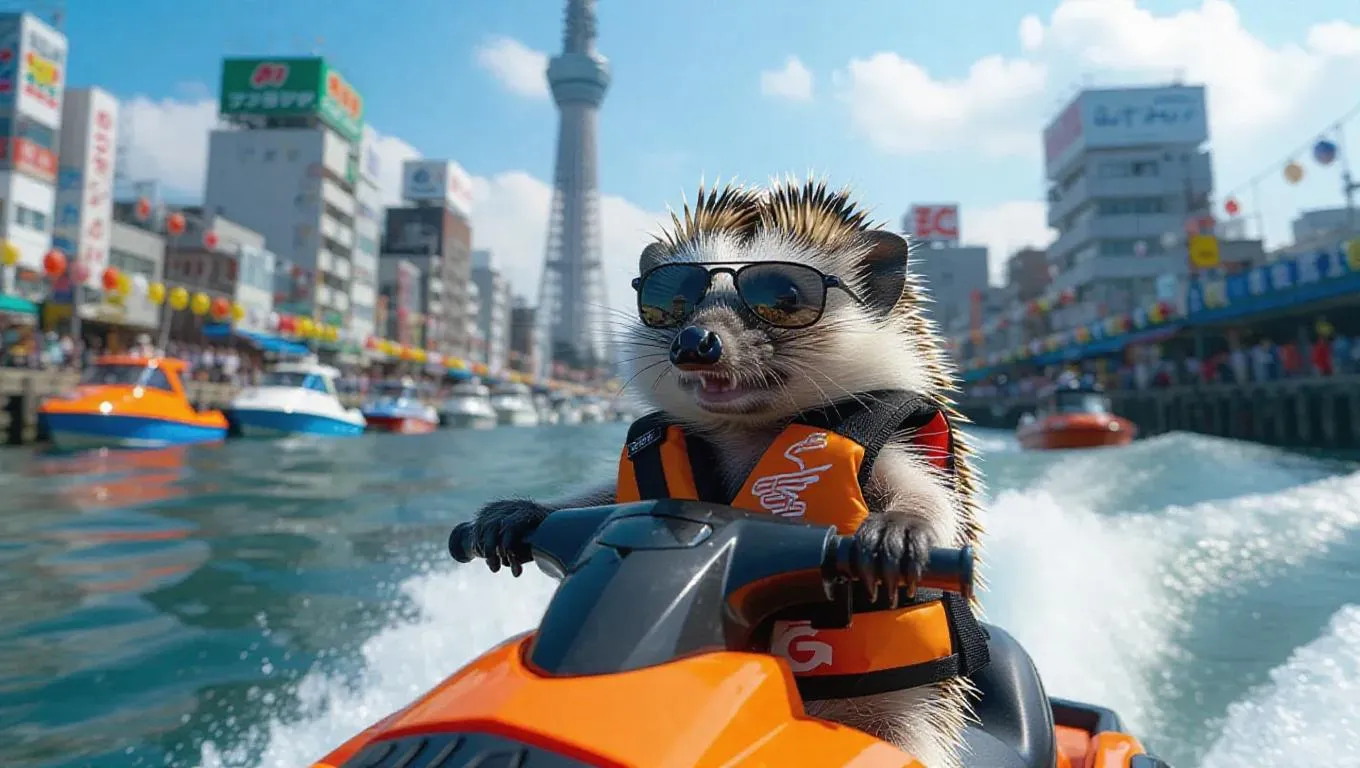 A lively hedgehog rides a mini jet ski through the bustling waterfront of Fukuoka, Japan, its tiny quills standing on end. The hedgehog sports a life jacket and aviator sunglasses, its eyes bright with thrill. Surrounding it, colorful boats and festival decorations create a lively backdrop. In the background, the iconic Fukuoka Tower reaches for the clouds, its silhouette clear against a sunny day. The breeze carries the scent of fresh seafood and the sounds of waves crashing.