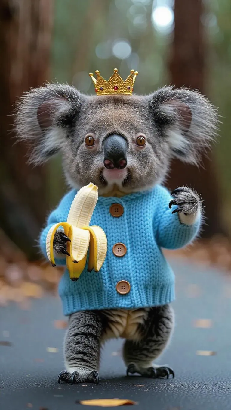 A sleepy koala prances down the runway with a curious and wide-eyed expression. It wears a cozy, sky-blue sweater and a tiny crown-shaped hat. The koala holds a small banana in its paw, adding to its whimsical charm.