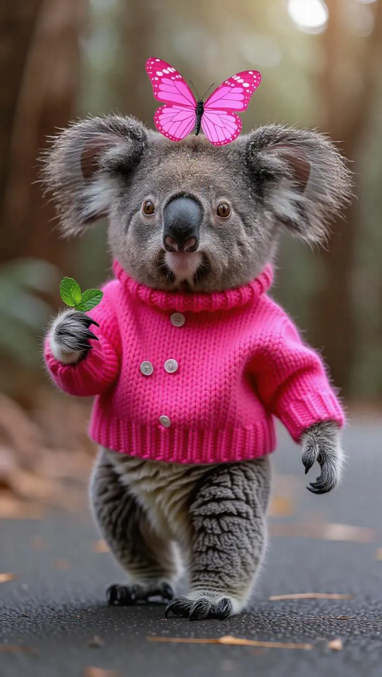 A dreamy koala waddles down the runway with a whimsical and fanciful expression. It wears a bright pink sweater and a tiny butterfly-shaped hat. The koala holds a small mint leaf in its paw, enhancing its charming aura.