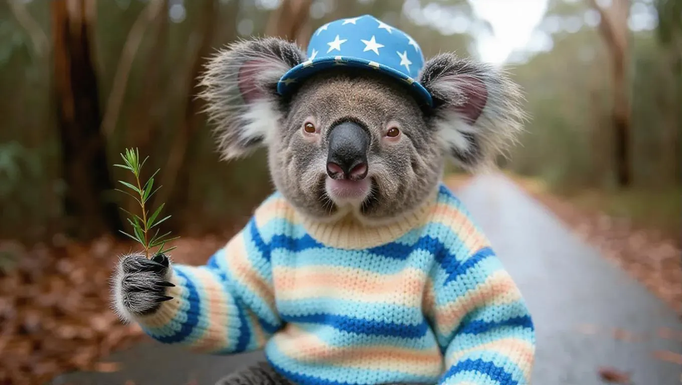 A joyful koala lounges down the runway with a relaxed and easygoing expression. It wears a striped, pastel-blue sweater and a tiny hat with stars. The koala holds a small sprig in its paw, enhancing its carefree mood.