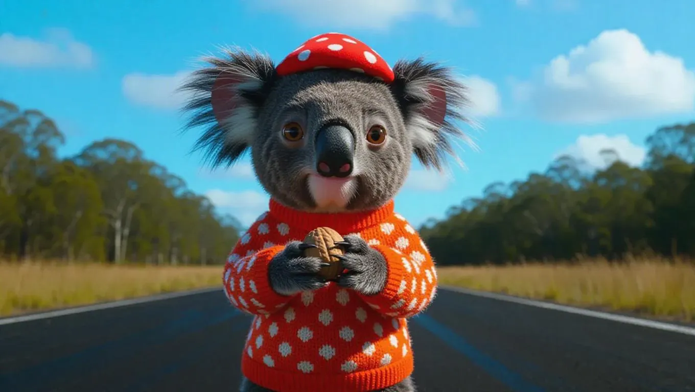 A sleepy koala scuttles down the runway with a shy and bashful expression. It wears a dotted, coral sweater and a tiny mushroom-shaped hat. The koala holds a small nut in its paw, adding to its gentle charm.