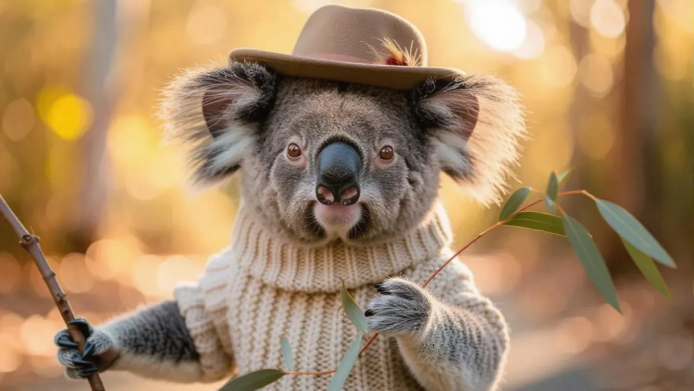 A sleepy koala ambles down the runway with an elegant and sophisticated expression. It wears a sophisticated, beige sweater and a tiny feathered hat. The koala holds a small twig in its paw, enhancing its graceful demeanor.