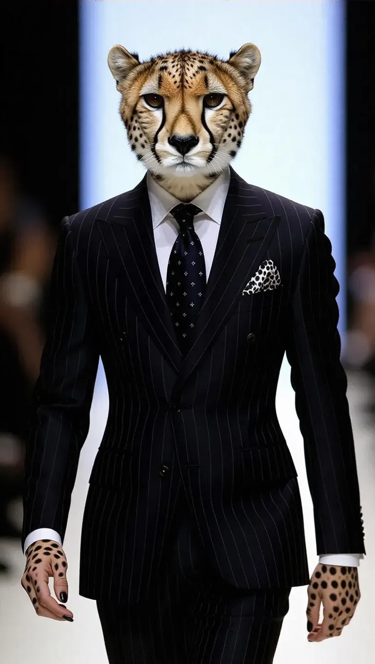 The sleek cheetah, wearing a tailored pinstripe suit with a pocket square, strides down the runway with a confident look. The camera follows its powerful steps, capturing the movement of the suit and the cheetah's sleek spots. The background remains a sleek, minimalist runway, highlighting the cheetah's sophisticated and bold charm.