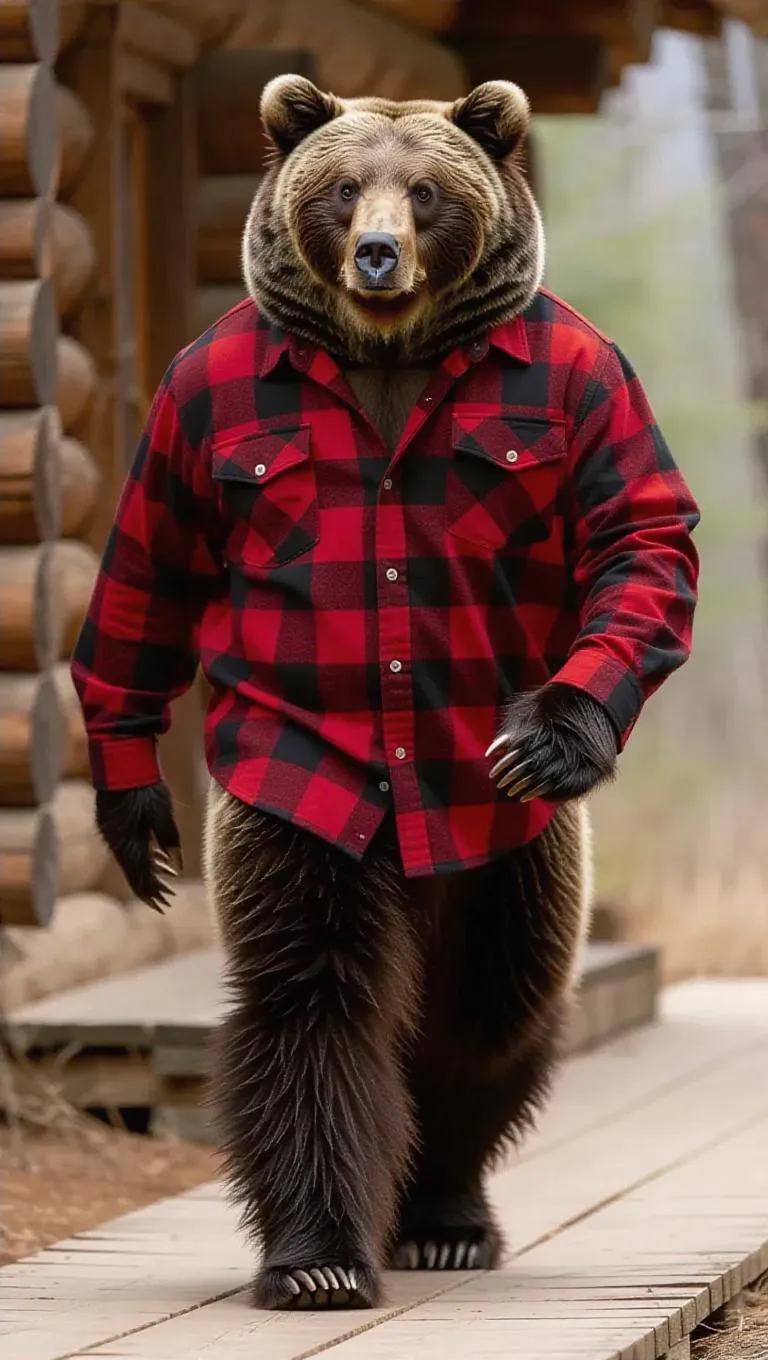 The robust bear, wearing a cozy flannel shirt with rolled sleeves, ambles down the runway with a relaxed demeanor. The camera captures its big strides, showcasing the shirt's warmth and the bear's fluffy fur. The background is a rustic cabin setting, exuding comfort and strength that complements the bear's nature.