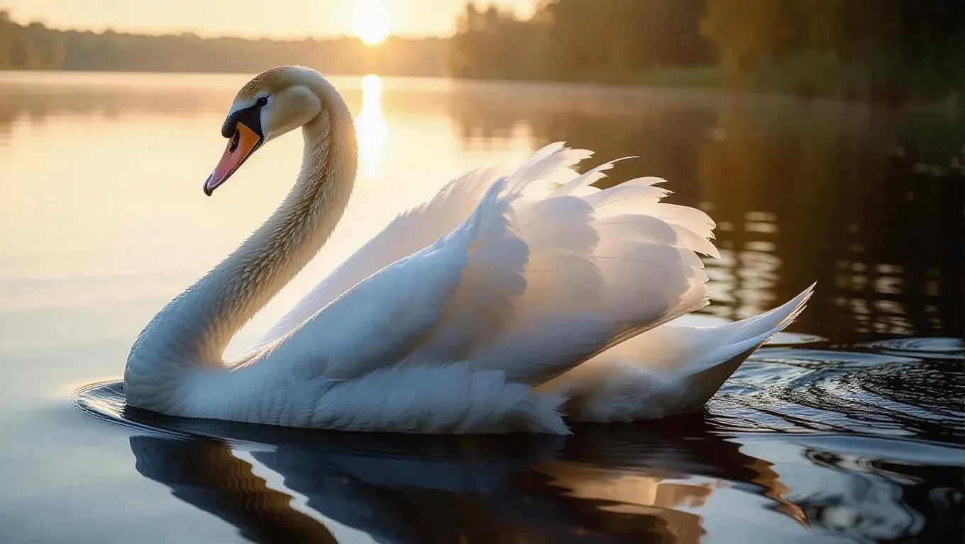 The graceful swan, dressed in a flowing gown with intricate lace, glides down the runway with elegance. The camera captures the gown's delicate movements, highlighting the swan's pristine feathers. The background is a serene lake at dawn, reflecting the beauty of the swan's poise and grace.