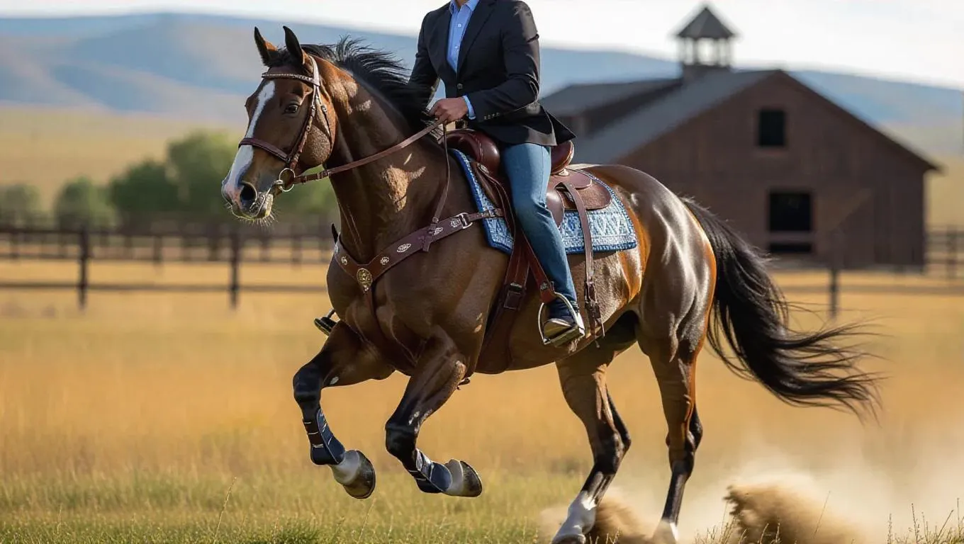 The noble horse, clad in a fitted saddle blanket with intricate designs, gallops down the runway with pride. The camera captures its powerful physique, focusing on the blanket's craftsmanship and the horse's shiny coat. The backdrop is an expansive ranch, highlighting the horse's strength and freedom.