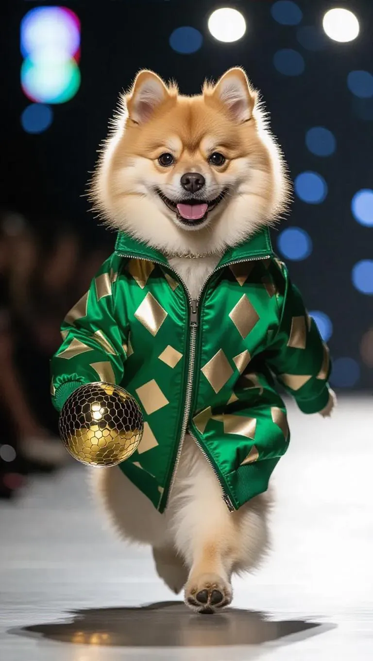 The fluffy dog, wearing a chic green jacket with geometric patterns and holding a shiny ball, struts down the runway with a proud demeanor. The camera follows its confident strides, showcasing the sway of the jacket and the dog's alert ears. The background showcases a modern, urban-inspired runway, highlighting the dog's fashionable and spirited charm.