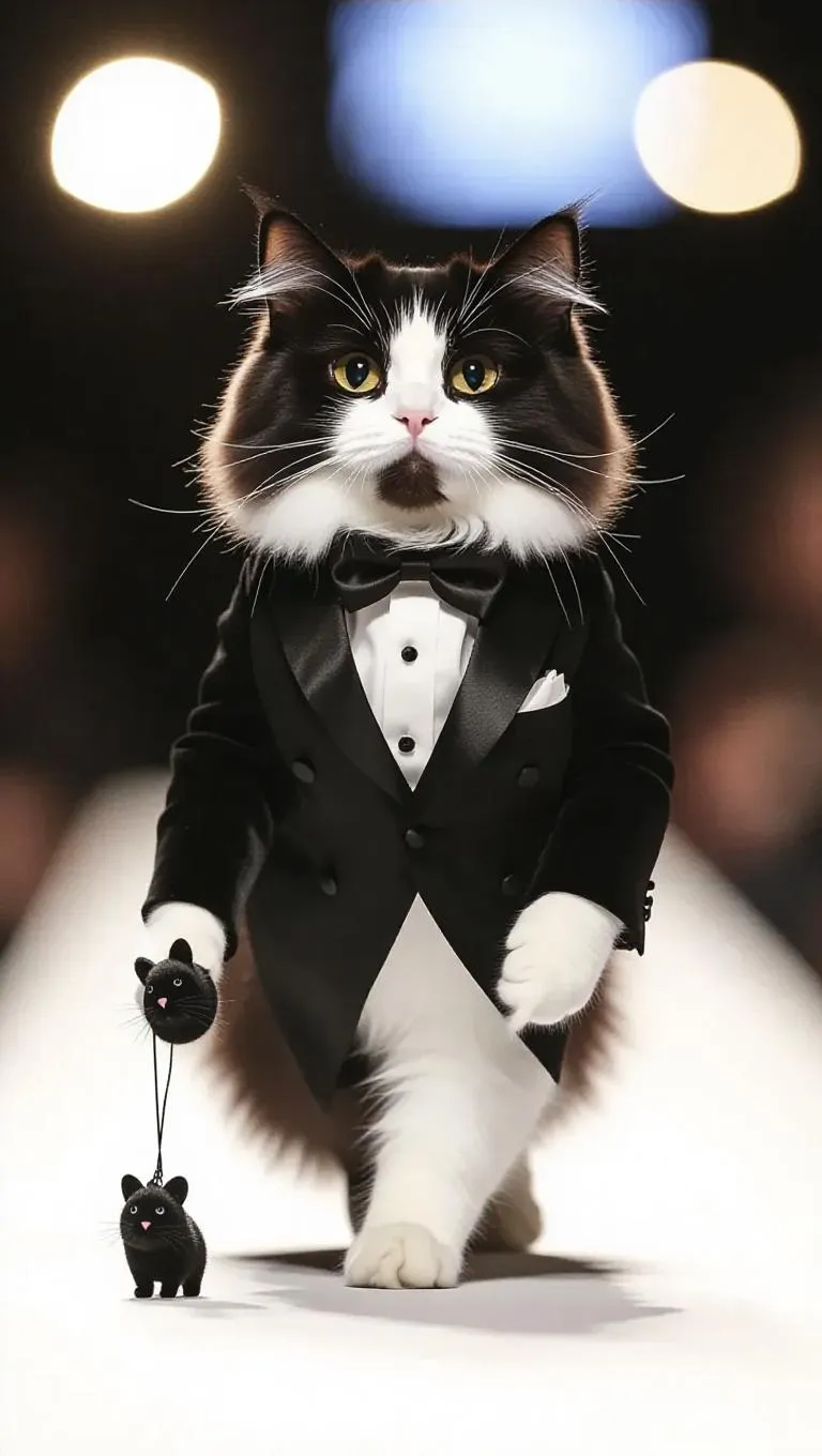 The fluffy feline, dressed in an elegant black tuxedo with a bow tie and carrying a small toy mouse, walks down the runway with a regal demeanor. The camera captures its graceful strides, emphasizing the neatness of the tuxedo and the cat's poised whiskers. The background features a classy, upscale runway, highlighting the cat's sophisticated and charming side.