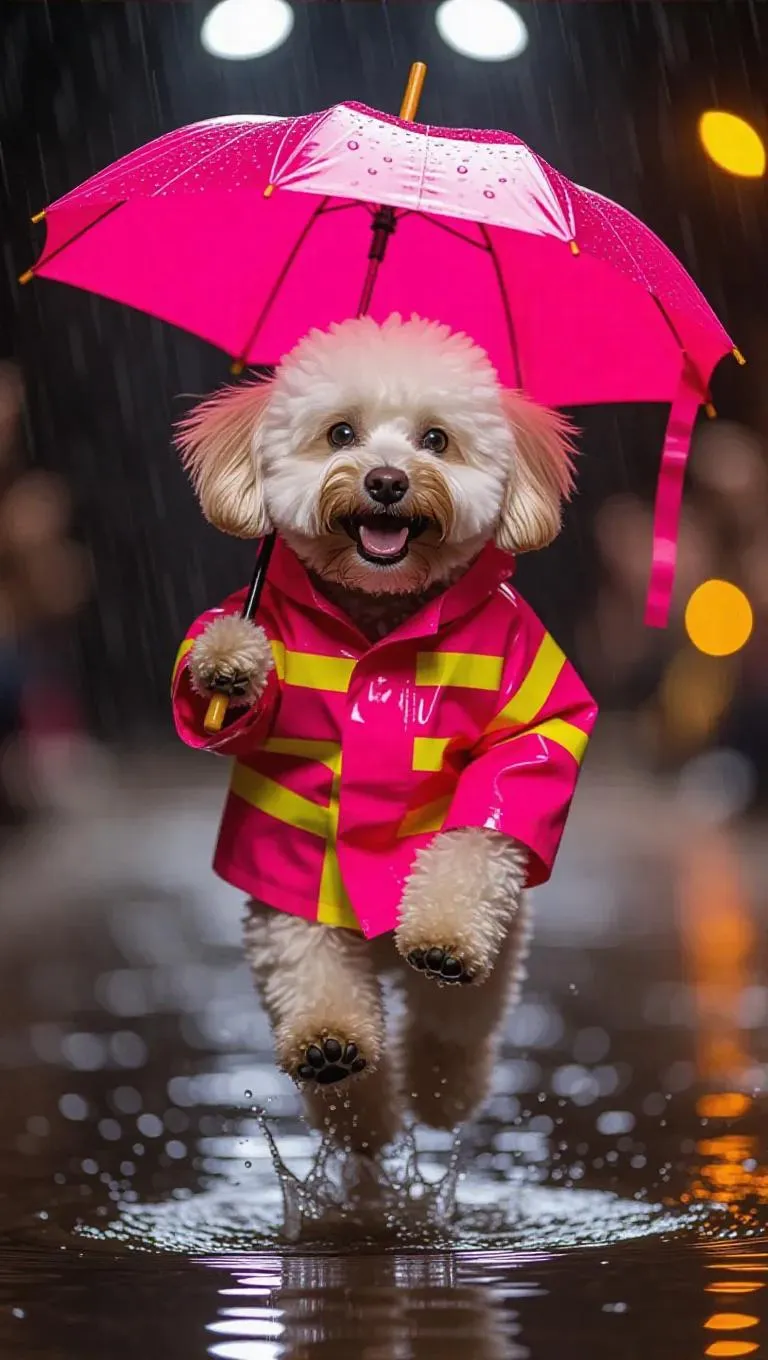 The fluffy dog, wearing a neon pink raincoat with stripes and carrying an umbrella, splashes down the runway with a playful expression. The camera catches every puddle jump, showcasing the flapping of the raincoat and the dog's wagging tail. The background is a whimsical, rainy-themed runway, enhancing the dog's cheerful and adventurous nature.