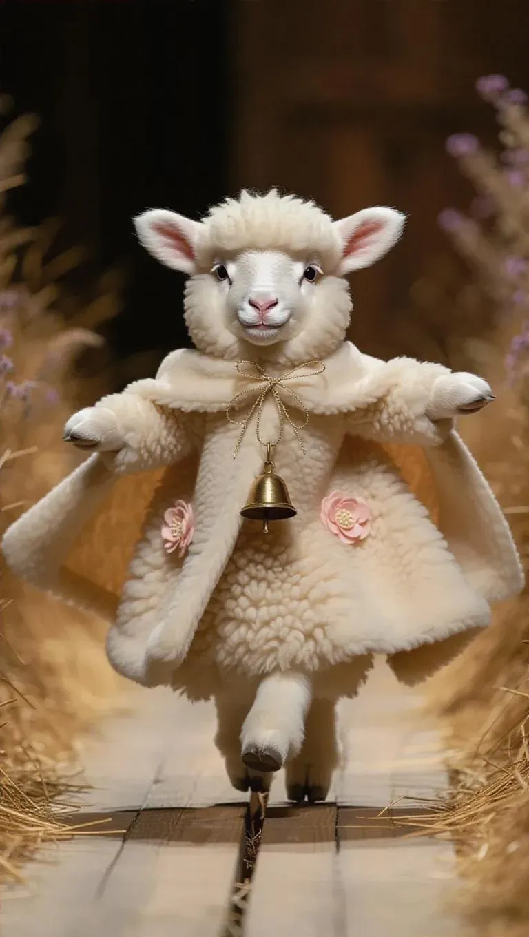 The fluffy lamb, adorned in a cozy cream cape with flower embellishments and holding a little bell, twirls down the runway with a joyful look. The camera captures its charming spins, emphasizing the flow of the cape and the lamb's bright eyes. The background features a rustic, countryside-themed runway, highlighting the lamb's sweet and endearing character.