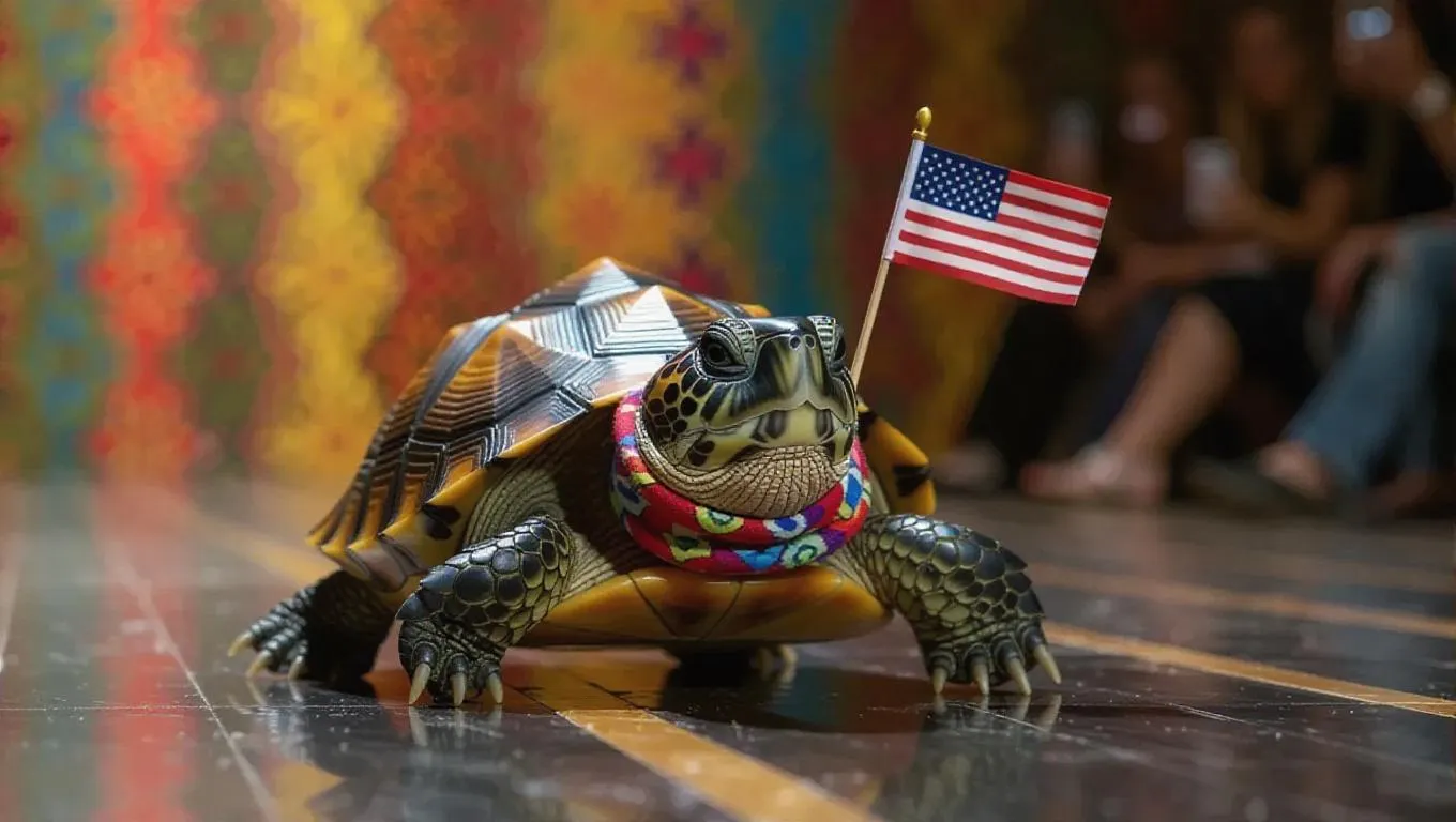 The fluffy turtle, adorned in a funky patterned scarf and carrying a tiny flag, crawls down the runway with a determined look. The camera tracks its slow and steady progress, showcasing the movement of the scarf and the turtle's wise eyes. The background is a lively, adventure-themed runway, enhancing the turtle's endearing and persistent nature.