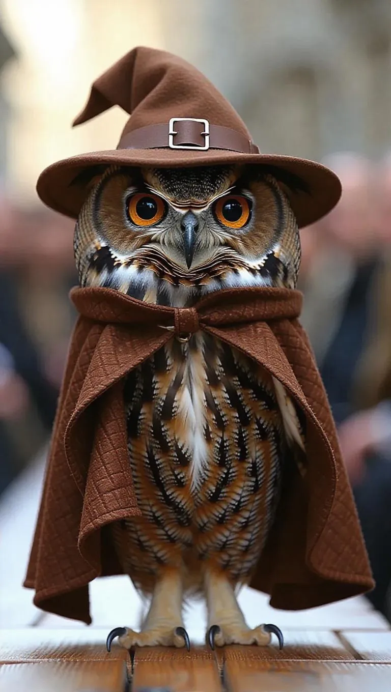 A whimsical owl perches down the runway with an air of wisdom, its large eyes scanning the crowd. It wears a cozy brown cloak that flows gently, and a wise old hat settles atop its head. The owl's movements are slow and deliberate, intriguing the audience.