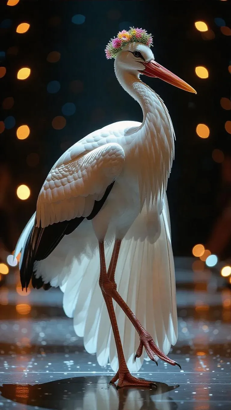 A radiant stork wades down the runway with an air of grace, its long legs elongated elegantly. It wears a shining white cape that reflects the lights beautifully, and a fancy flower crown graces its head. The stork's movements are fluid and magical, enchanting the audience.