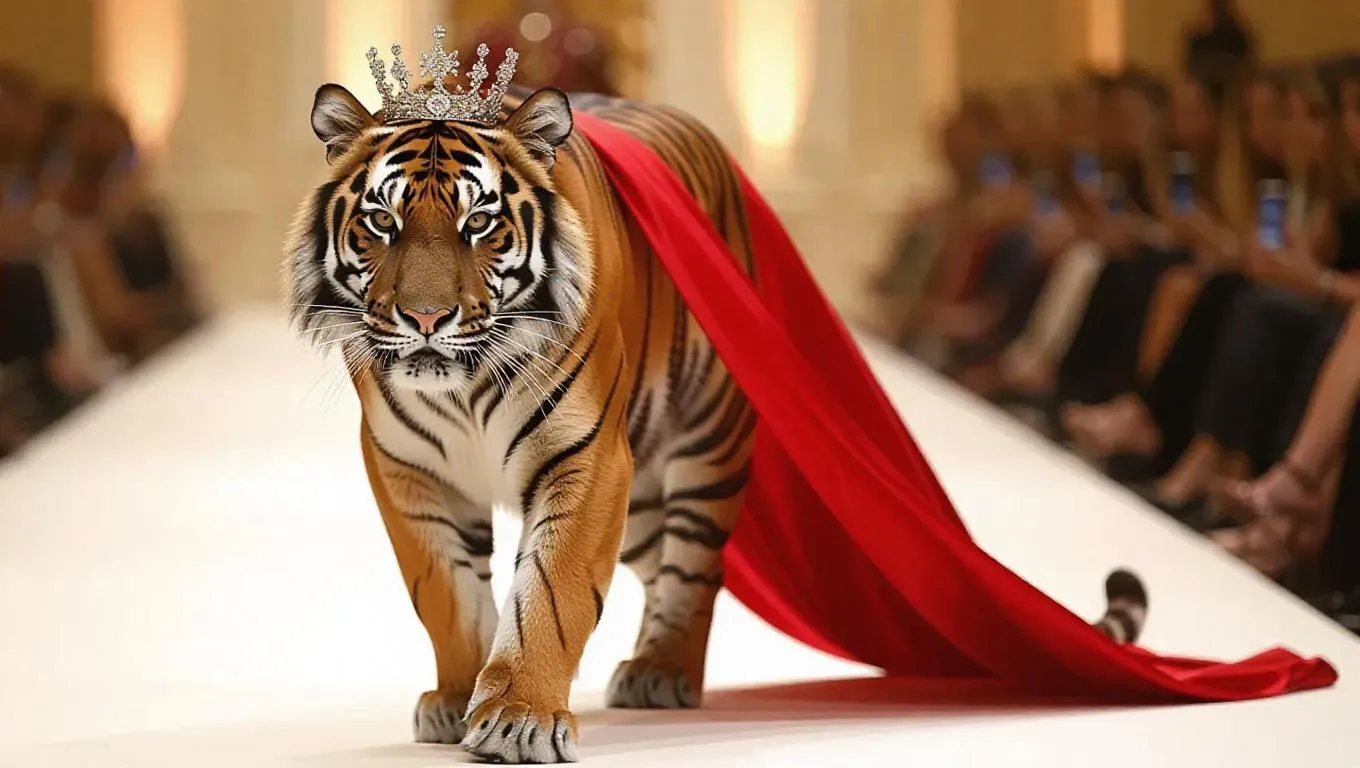 An elegant tiger glides down the runway with an air of fierceness, its stripes bold against its golden coat. It wears a regal red cape that flows nobly behind, and a stunning tiara rests upon its head. The tiger's movements are powerful and mesmerizing, captivating the audience.