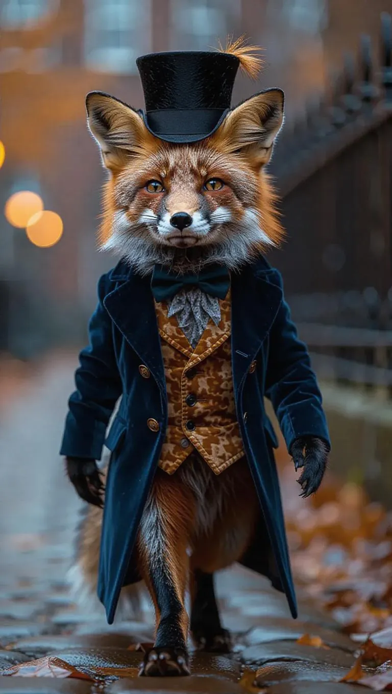 A clever fox slyly makes its way down the walk with a mischievous grin. It wears a sleek, blue velvet jacket and a tiny top hat, giving it a dapper look. The fox's bushy tail sways as it walks, adding to its charm.